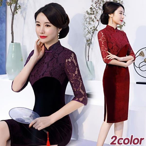 チャイナドレス 七分袖 膝丈 花柄 スカート 体型カバー チャイナ服 ワンピース ドレス